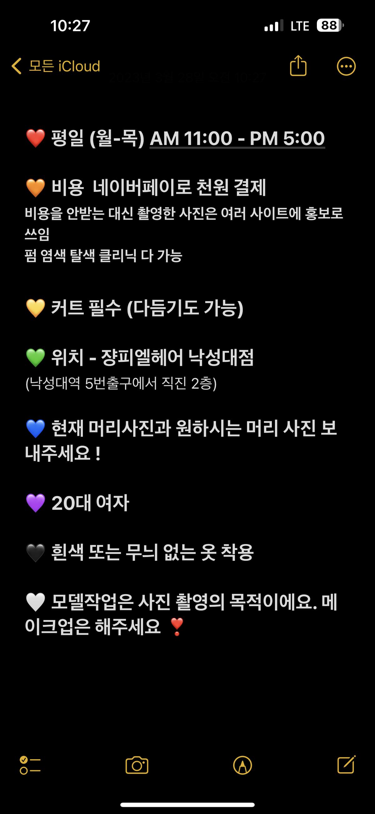 디자이너 승급 한지 얼마 되지 않아 리뷰와 사진 목적으로 헤어 모델 구하고 있습니다.